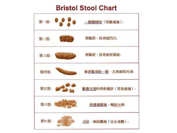 根据布里斯托大便分类法 (Bristol Stool Scale),将便便大致分为7类﹕